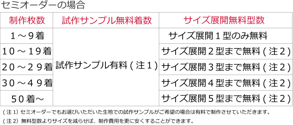 制作枚数ごとの試作サンプル無料着数とサイズ展開無料型数