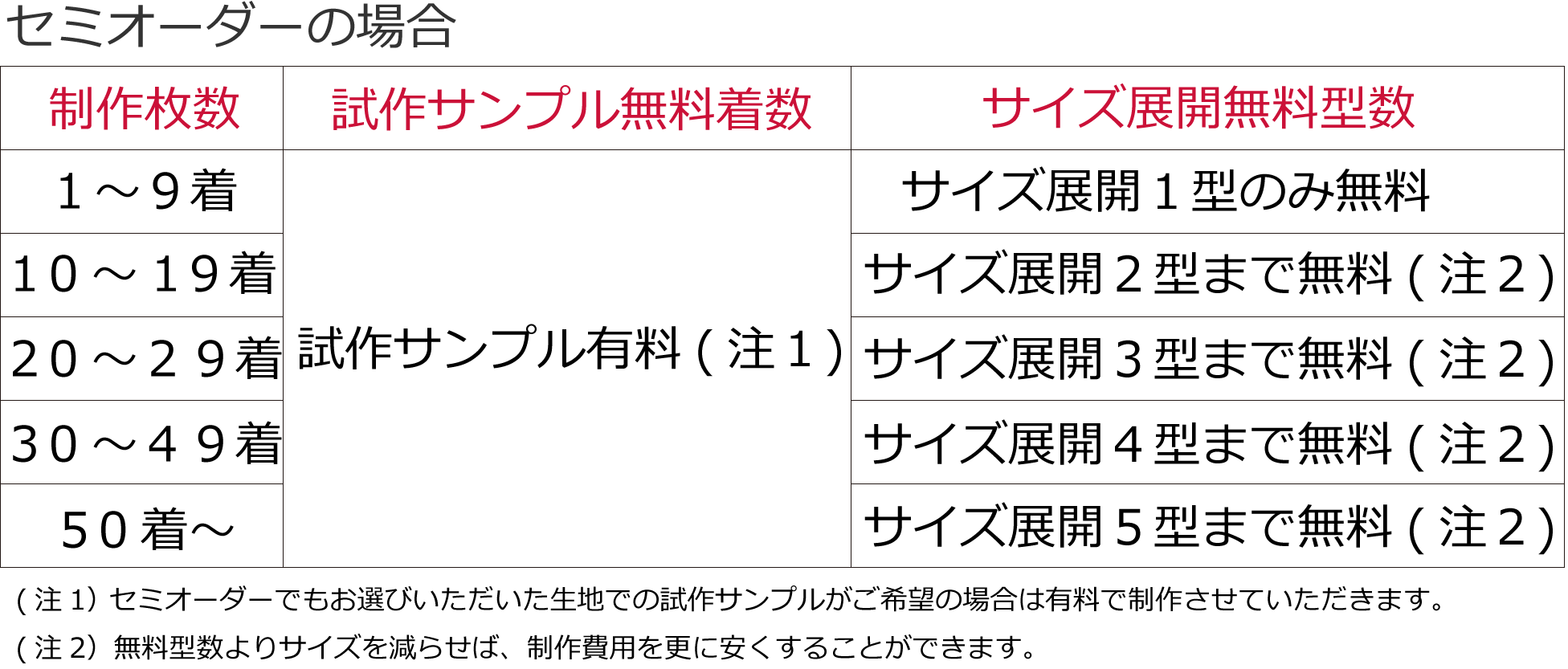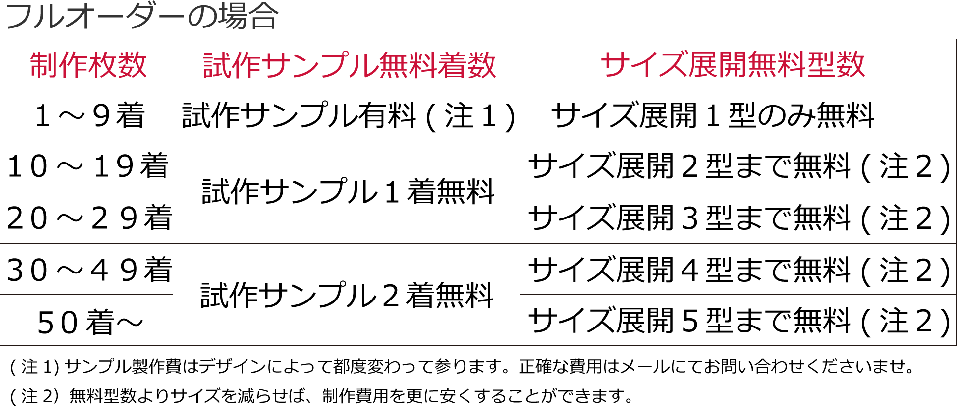 制作枚数ごとの試作サンプル無料着数とサイズ展開無料型数