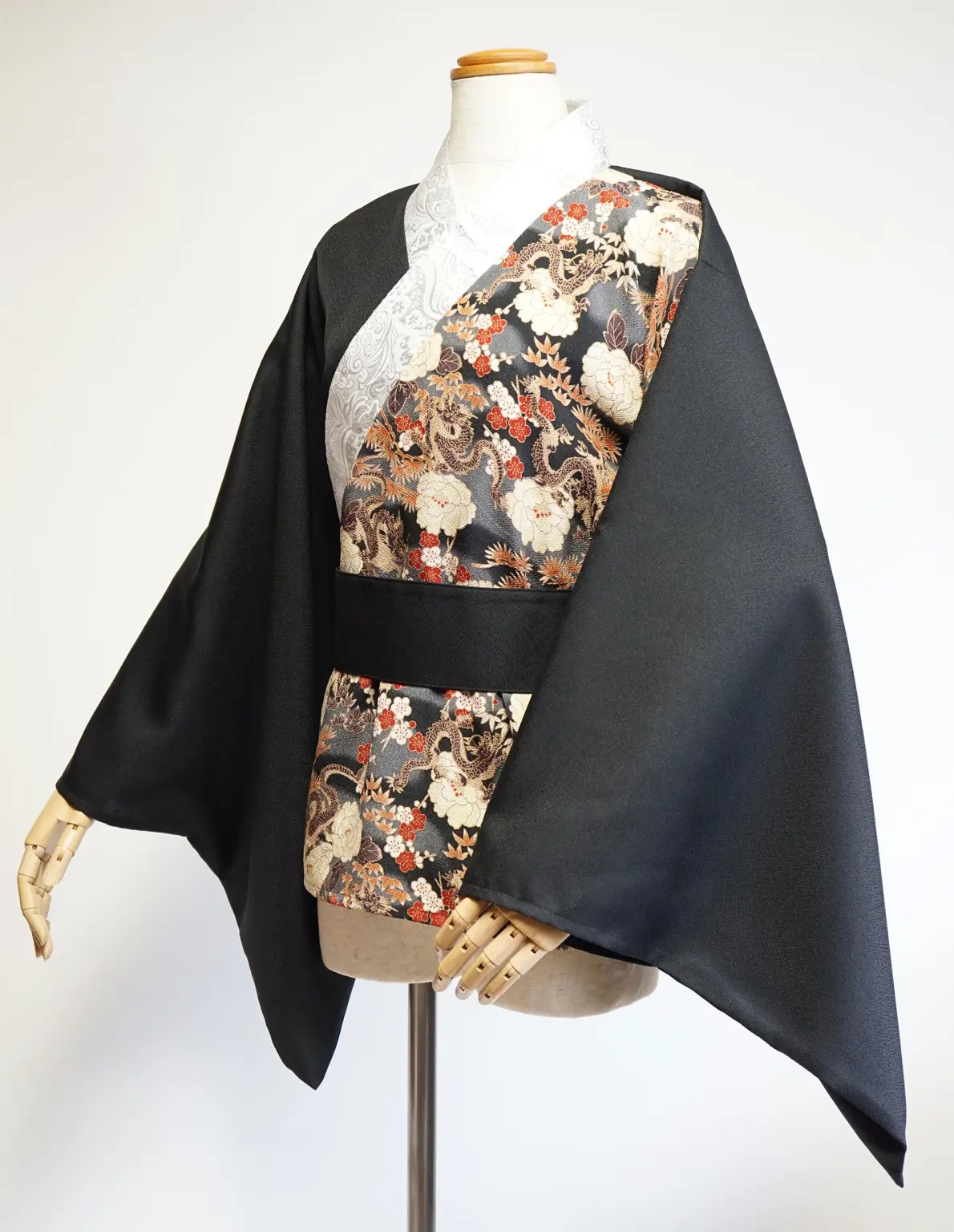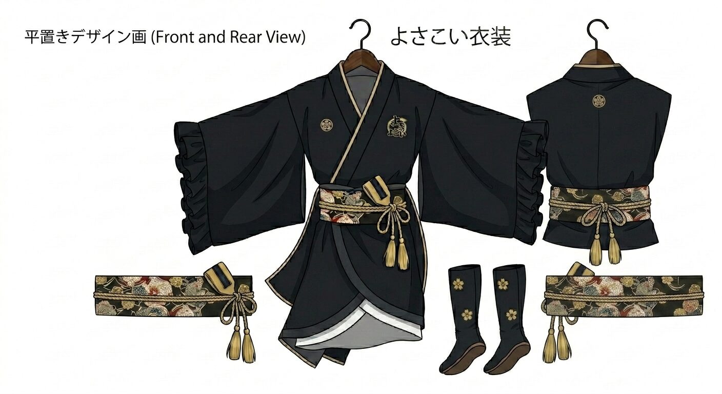 プロンプト「よさこい 衣装 平置きのデザイン画 黒ベース 模様少なめ 左側に前から見た図 右側に後ろから見た図」