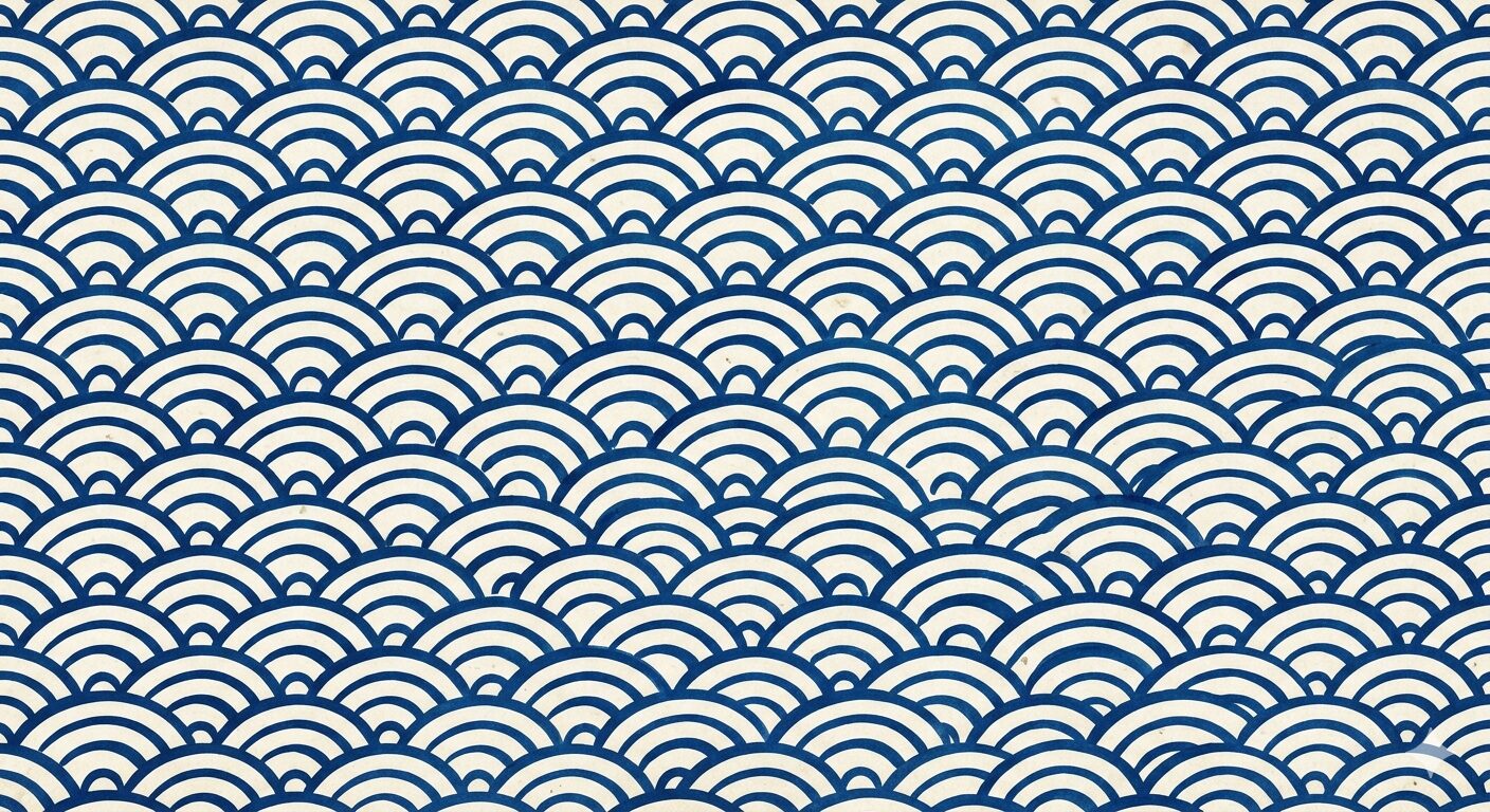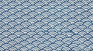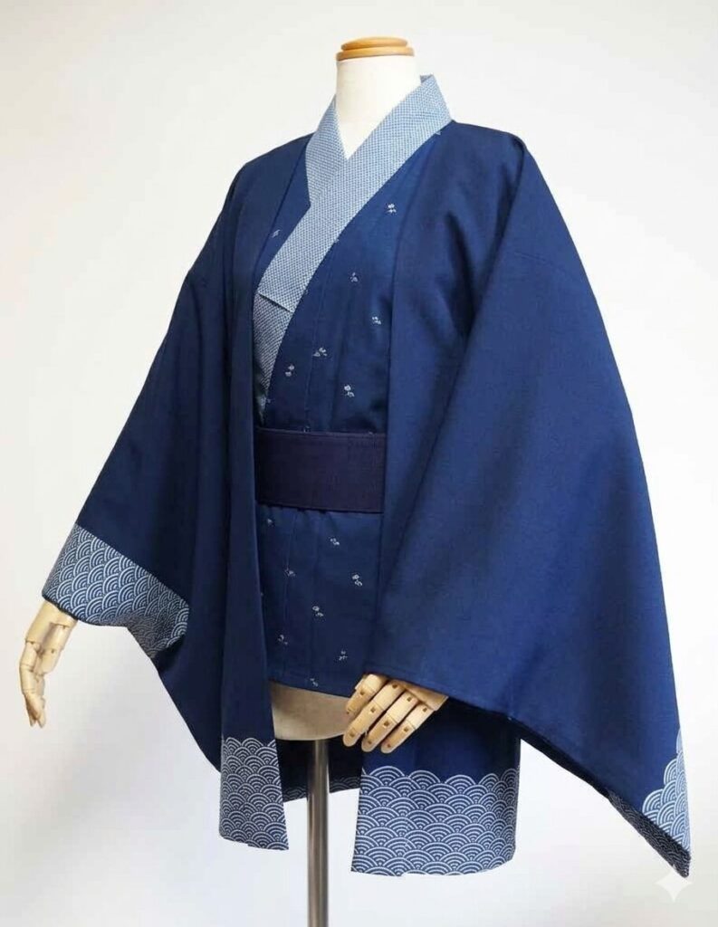 プロンプト「この画像をベース 波模様を袖と身頃の裾にレイアウト 全体のカラーは青系 模様少なめ」