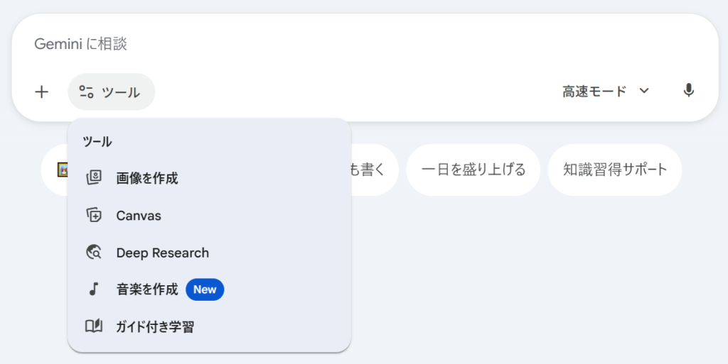 各生成AIのプロンプトの入力枠の左下にGeminiではツール、ChatGPTでは+のボタンがありますので、そちらを押して画像作成モードに変更してからプロンプトを入力します。
