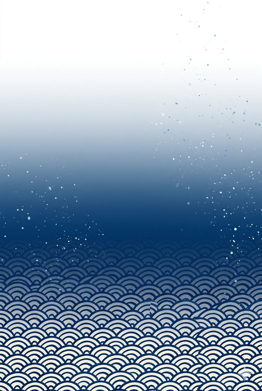 プロンプト「縦長の長方形 背景画像 上が白で下が青のグラデーション 下1/4に画像の波模様 波模様の上部はグラデーションで透明に変化 飛沫を全体にちりばめる」