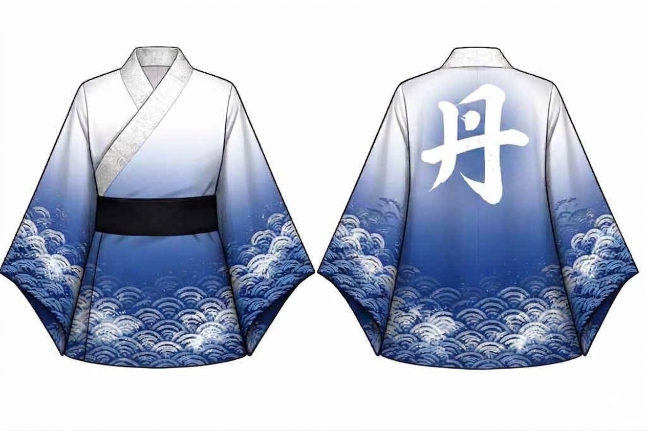 プロンプト「よさこい 衣装 平置きのデザイン画 左側に前から見た図 右側に後ろから見た図 着物の画像をベース 波模様を身頃と袖に 背中に丹の筆文字」